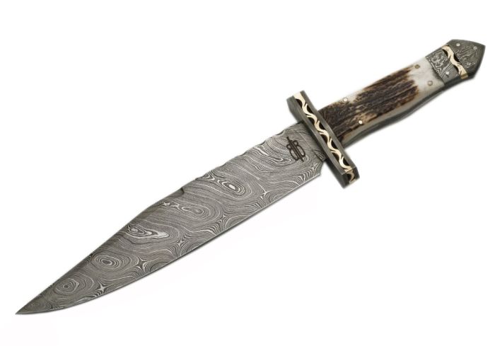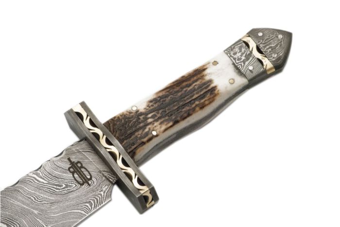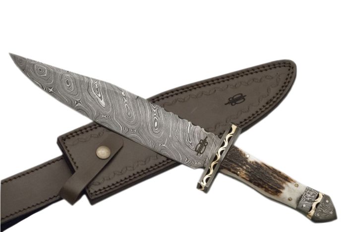 The Big Game TX Bowie by BnB is a masterfully crafted fixed blade knife designed for serious hunters. Its 256-layer Damascus steel blade, made from 1095 and 15N20 steels, features a clip point with a swedge for precise cutting and enhanced durability. The handle combines ergonomically shaped stag scales with a Damascus-plated hilt, accented by brass filigree and a protective guard to prevent slippage during use. This knife balances aesthetic sophistication with functional strength and comes complete with a premium leather sheath for secure, convenient carry.