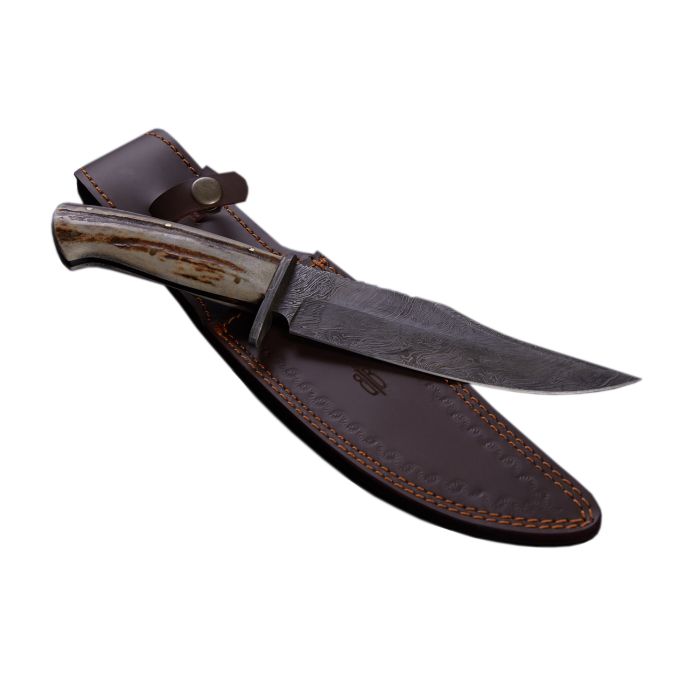 The King Stag Bowie showcases exceptional craftsmanship with its 1095 steel core layered 256 times in a unique Damascus pattern across the blade and hilt. Its stag handle is complemented by a twisted Damascus bolster and butt cap, enhancing grip and durability. This knife comes with a premium double-stitched leather sheath featuring an insert, belt loop, and secure lock strap for reliable carry and protection in the field. Ideal for collectors and outdoor enthusiasts seeking a blend of strength, style, and precision.