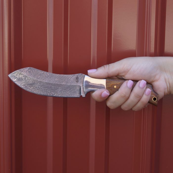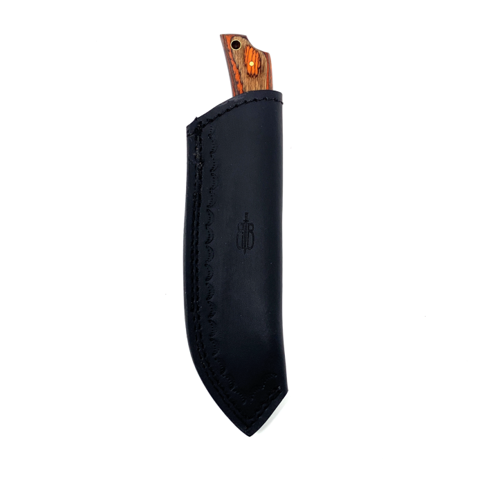 The BnB Knives Recurve Wood Hunter bnb24124 features a distinctive upswept Damascus steel blade with detailed filework on the thumb rest, providing enhanced grip and precision. Crafted with full tang construction for superior strength, it has a stainless steel bolster paired with an elegant orange maple burl wood handle secured by brass pins. A practical lanyard hole adds versatility, while the included leather sheath with belt loop ensures convenient and safe carrying during field use. This knife is designed for hunters and skinners seeking reliability and refined craftsmanship.