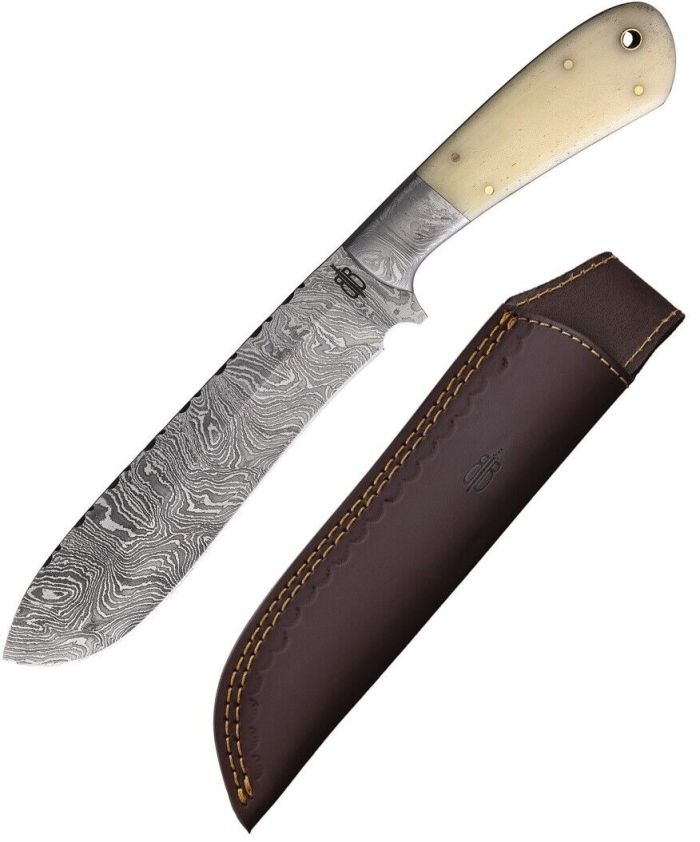 The BnB Knives Small Bone Machete showcases a masterfully crafted 256-layer Damascus steel Wharncliffe blade with a recurve belly and taper grind for precise and durable cutting performance. Constructed full tang for strength, it pairs polished bone scales and brass rivets on the handle to ensure a comfortable, secure grip. This utility fixed blade comes with a handcrafted brown premium leather sheath featuring a belt loop, combining elegance with practical portability for demanding outdoor and utility tasks.