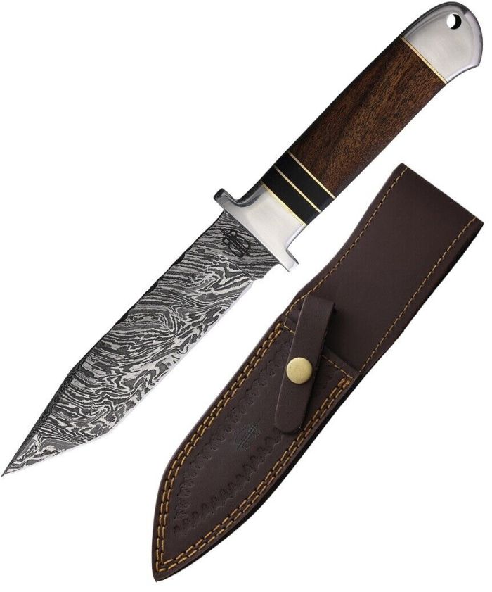 The Tanto Fighter Knife showcases a 256-layer Damascus steel blade crafted from 1095 and 15N20 steels, featuring a tanto point with a clip and detailed jimping-like grooves along the spine. Its bevel compound grind ensures precise cutting performance. The full tang construction includes polished stainless steel guard and bolsters paired with smooth Burl wood and micarta scales accented by brass. A lanyard hole adds utility, while the premium leather sheath with belt loop offers secure and convenient carrying. Designed for durability and expert use, this knife blends craftsmanship with practical design.