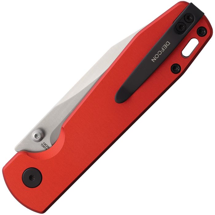 The Defcon Tier 1 Button Lock Red TD014RD features a durable 3.13" satin-finished 14C28N Sandvik stainless sheepsfoot blade, designed for precise cutting tasks. Its red aluminum handle offers a secure grip, enhanced by a thumb stud for quick deployment. Equipped with a reliable button lock mechanism, a lanyard hole, and a pocket clip, this knife combines safety, convenience, and portability in a compact 4.25" closed length. Packaged in a box, it’s a professional-grade tool built for everyday carry and demanding use.