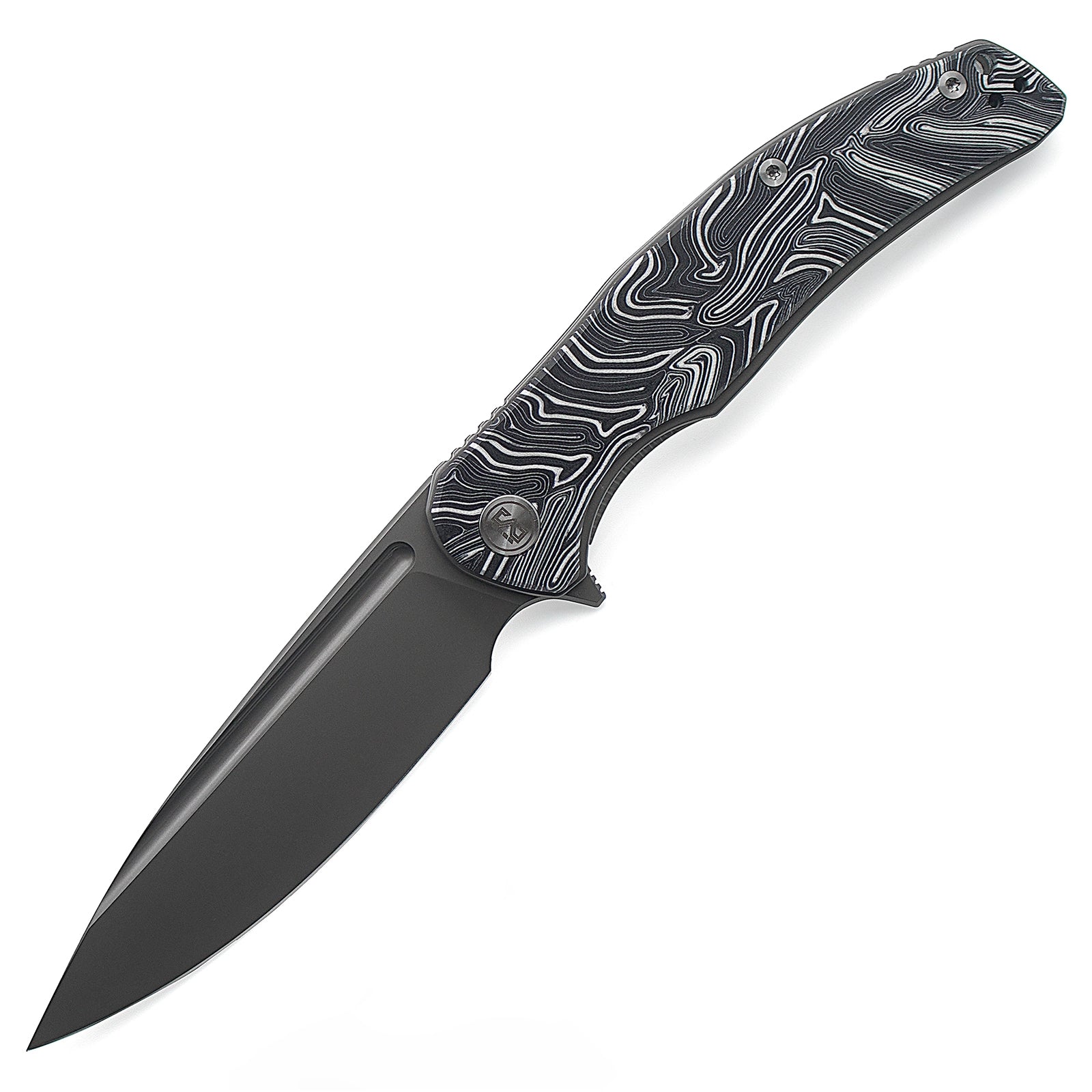 The handle is made from black Damascus-patterned G10, delivering a stylish look with a textured, ergonomic grip. The flipper opener ensures quick and smooth one-handed blade deployment, while the liner lock secures the blade safely in place during use.