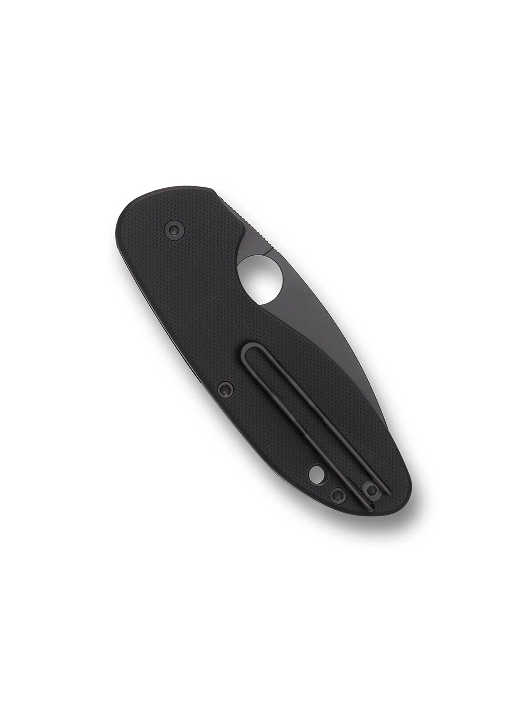 The handle is made of textured black G-10 scales over skeletonized stainless steel liners, providing a secure, ergonomic grip without adding unnecessary bulk. The knife utilizes a reliable liner lock for safe and confident use. Deployment is smooth and ambidextrous thanks to the Spyderco Round Hole™, and carry is discreet via a reversible hourglass-shaped clip set for tip-up carry.