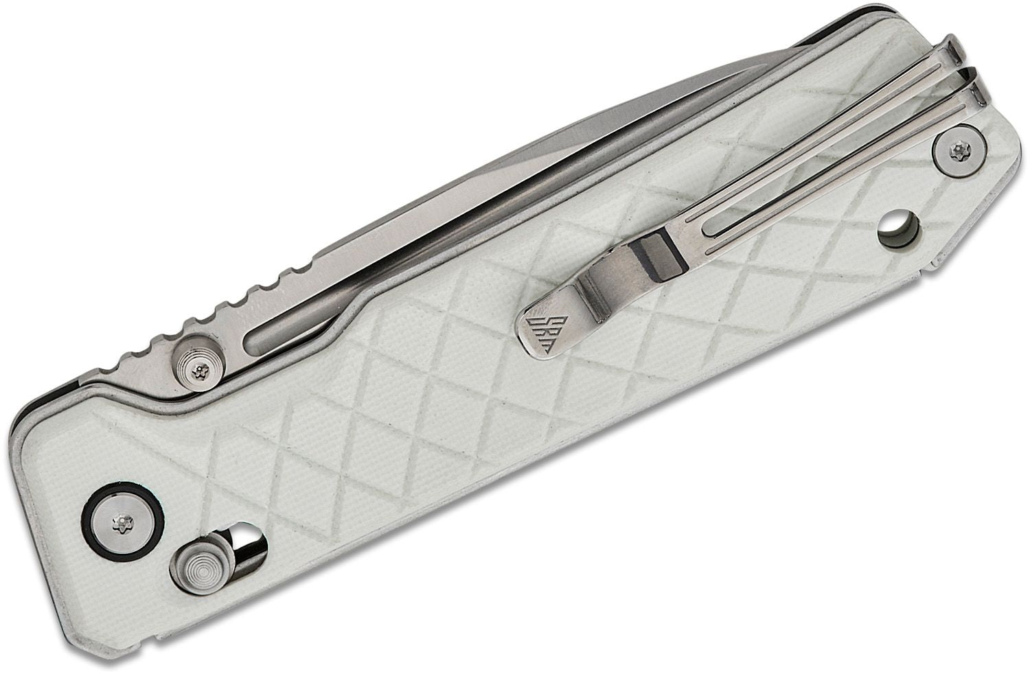 The Rubik 7228B-GT is a durable and stylish folding knife featuring a 3.4-inch drop point blade made from 14C28N steel with a hardness rating of 57-59 HRC and a brushed finish for a classic look. The blade is 3.1 mm thick, providing solid strength for everyday cutting tasks. The handle is crafted from white G10, offering excellent grip and durability. Equipped with a ceramic ball bearing pivot, the knife opens smoothly, while the ambidextrous crossbar lock ensures secure blade locking. The reversible ambidextrous pocket clip adds convenience for both right- and left-handed carry. Weighing just under 4 ounces, the Rubik 7228B-GT combines functionality with elegant design.