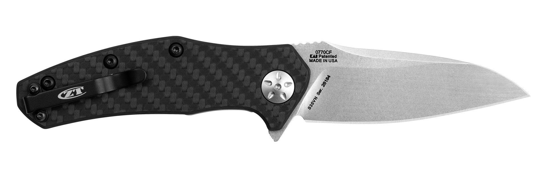 The ZT 0770CF draws its inspiration from the legendary, award-winning ZT 0777, bringing that same flowing design and premium performance into a more compact and accessible package. The 3.25-inch blade is made from CPM S35VN, a high-performance steel known for edge retention, wear resistance, and toughness, all topped with a stonewashed finish to hide wear from daily use. Its carbon fiber handle is not only lightweight and visually striking but also ergonomically contoured to provide a secure, comfortable grip. The assisted opening mechanism ensures quick, reliable deployment with a simple pull of the flipper tab. With its deep-carry reversible clip, slim profile, and made-in-USA craftsmanship, the 0770CF is the perfect blend of elegance and utility and ideal for everyday carry.
